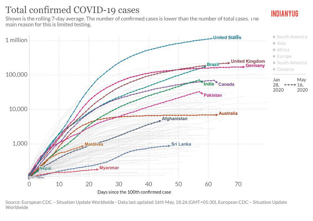 At this point in time, all of them seem to be doing better than India with respect to the logarithmic graph of the total number of confirmed cases.