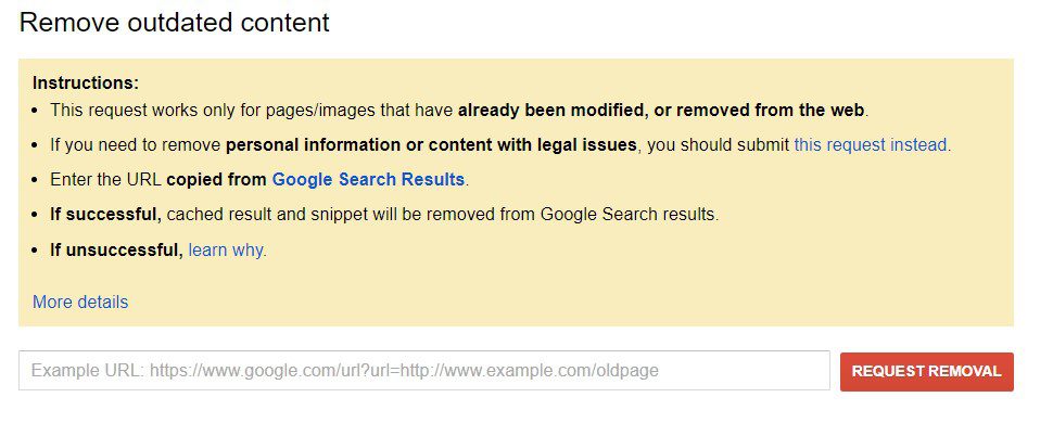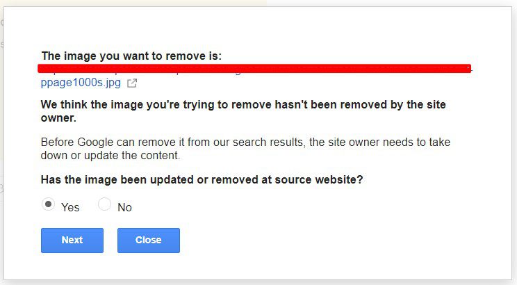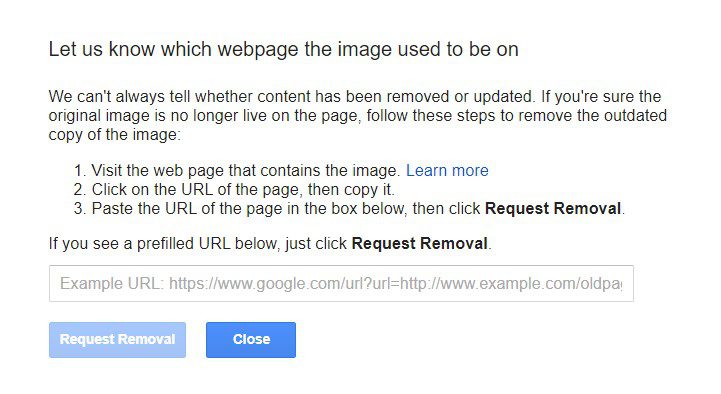 4. Add a link to the image in the field and click on the button “Request removal”.