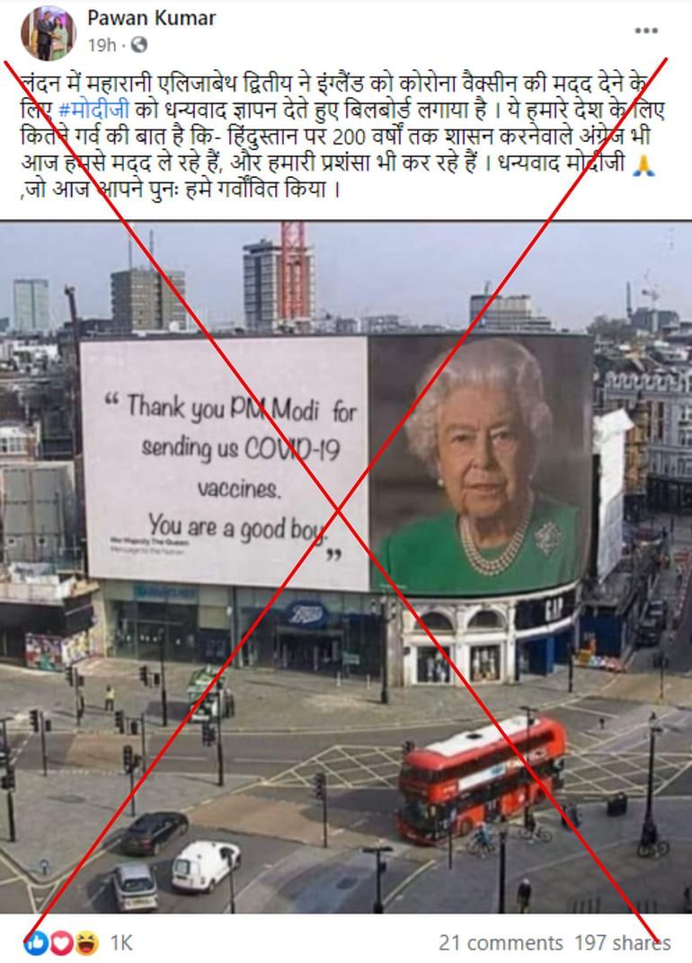 The caption in Hindi along with the image translates as, “Queen Elizabeth II in London has set up a billboard thanking Modiji for helping England with the corona vaccine. Thank you Modiji for making us proud again. “
