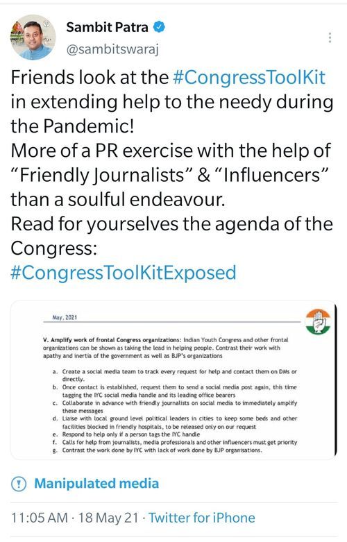 Twitter had been asked to clarify why BJP spokesperson Sambit Patra’s tweet on May 18, which had screenshots of what he called a “Congress toolkit” aimed at discrediting Prime Minister Narendra Modi and the government’s handling of Covid, were flagged “manipulated media”.