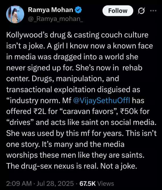 Then came the name: Vijay Sethupathi, the actor whose gentle public persona has earned him the tag “People’s Treasure.” According to Ramya, he offered the woman Rs 2 lakh for “caravan favours” and smaller cash amounts for “long drives to Mahabalipuram.”